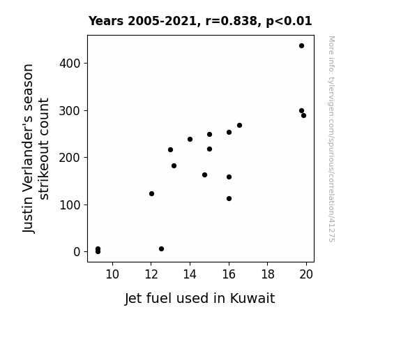 This means 70.1% of the change in the one variable (i.e., Jet fuel used in Kuwait) is predictable based on the change in the other (i.e., Justin Verlander's season strikeout count) over the 17 years from 2005 through 2021.