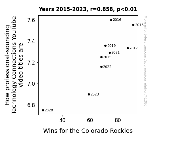 This means 73.7% of the change in the one variable (i.e., Wins for the Colorado Rockies) is predictable based on the change in the other (i.e., How professional-sounding Technology Connections YouTube video titles are) over the 9 years from 2015 through 2023.