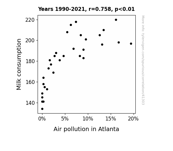 This means 57.4% of the change in the one variable (i.e., Air pollution in Atlanta) is predictable based on the change in the other (i.e., Milk consumption) over the 32 years from 1990 through 2021.