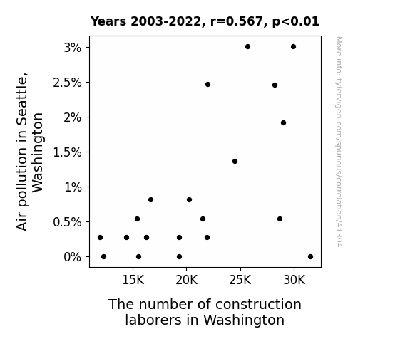 This means 32.1% of the change in the one variable (i.e., The number of construction laborers in Washington) is predictable based on the change in the other (i.e., Air pollution in Seattle, Washington) over the 20 years from 2003 through 2022.