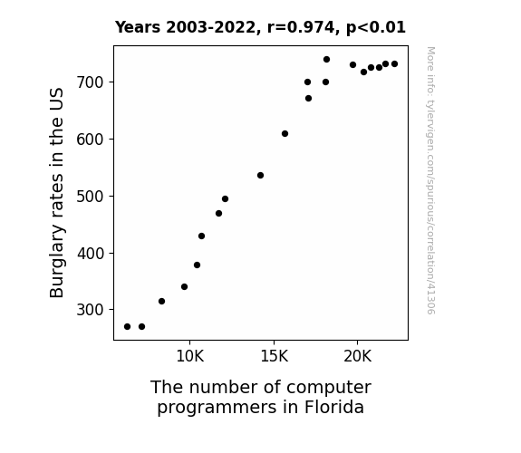 This means 94.8% of the change in the one variable (i.e., The number of computer programmers in Florida) is predictable based on the change in the other (i.e., Burglary rates in the US) over the 20 years from 2003 through 2022.