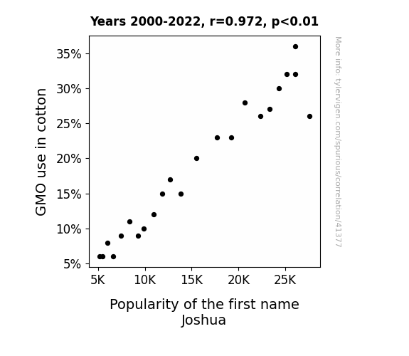 This means 94.5% of the change in the one variable (i.e., Popularity of the first name Joshua) is predictable based on the change in the other (i.e., GMO use in cotton) over the 23 years from 2000 through 2022.