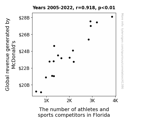 This means 84.3% of the change in the one variable (i.e., The number of athletes and sports competitors in Florida) is predictable based on the change in the other (i.e., Global revenue generated by McDonald's) over the 18 years from 2005 through 2022.