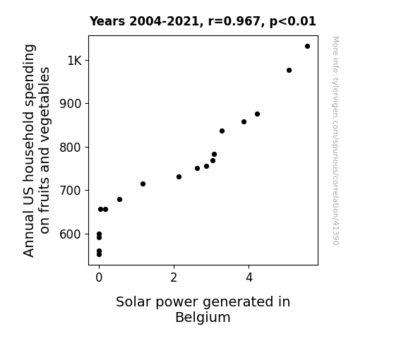 This means 93.5% of the change in the one variable (i.e., Solar power generated in Belgium) is predictable based on the change in the other (i.e., Annual US household spending on fruits and vegetables) over the 18 years from 2004 through 2021.