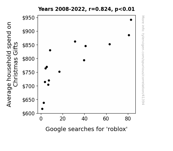 This means 67.9% of the change in the one variable (i.e., Google searches for 'roblox') is predictable based on the change in the other (i.e., Average household spend on Christmas Gifts) over the 15 years from 2008 through 2022.