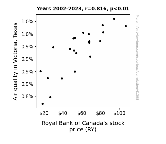 This means 66.6% of the change in the one variable (i.e., Royal Bank of Canada's stock price (RY)) is predictable based on the change in the other (i.e., Air quality in Victoria, Texas) over the 22 years from 2002 through 2023.