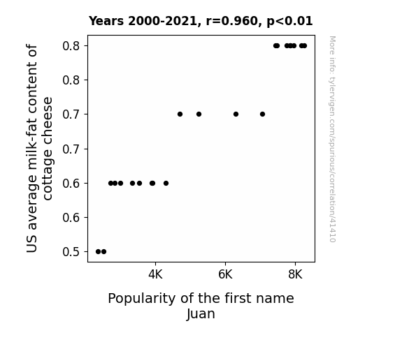 This means 92.2% of the change in the one variable (i.e., Popularity of the first name Juan) is predictable based on the change in the other (i.e., US average milk-fat content of cottage cheese) over the 22 years from 2000 through 2021.