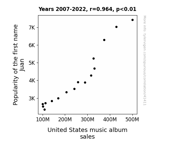 This means 92.9% of the change in the one variable (i.e., United States music album sales) is predictable based on the change in the other (i.e., Popularity of the first name Juan) over the 16 years from 2007 through 2022.