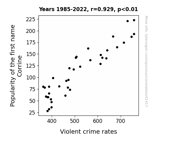This means 86.3% of the change in the one variable (i.e., Violent crime rates) is predictable based on the change in the other (i.e., Popularity of the first name Corrine) over the 38 years from 1985 through 2022.
