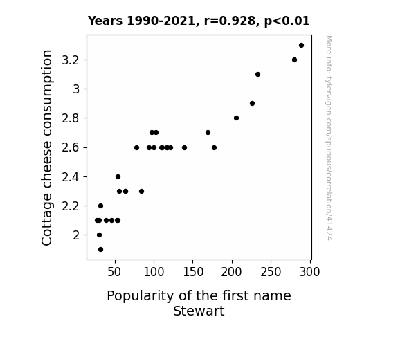 This means 86.2% of the change in the one variable (i.e., Popularity of the first name Stewart) is predictable based on the change in the other (i.e., Cottage cheese consumption) over the 32 years from 1990 through 2021.