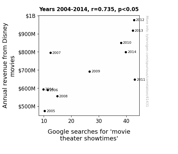 This means 54% of the change in the one variable (i.e., Google searches for 'movie theater showtimes') is predictable based on the change in the other (i.e., Annual revenue from Disney movies) over the 11 years from 2004 through 2014.