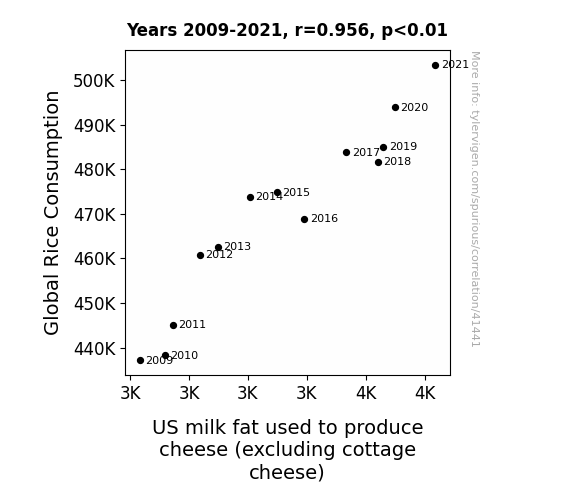 This means 91.4% of the change in the one variable (i.e., US milk fat used to produce cheese (excluding cottage cheese)) is predictable based on the change in the other (i.e., Global Rice Consumption) over the 13 years from 2009 through 2021.
