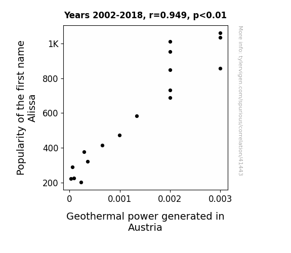 This means 90.1% of the change in the one variable (i.e., Geothermal power generated in Austria) is predictable based on the change in the other (i.e., Popularity of the first name Alissa) over the 17 years from 2002 through 2018.