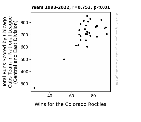 This means 56.6% of the change in the one variable (i.e., Wins for the Colorado Rockies) is predictable based on the change in the other (i.e., Total Runs Scored by Chicago Cubs Team in National League (Central and East Division)) over the 30 years from 1993 through 2022.
