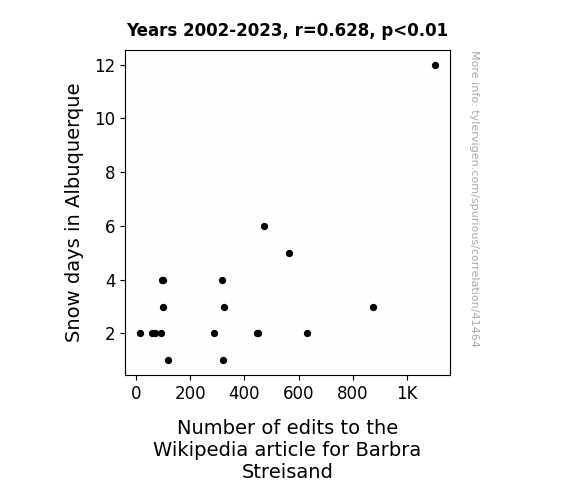 This means 39.4% of the change in the one variable (i.e., Number of edits to the Wikipedia article for Barbra Streisand) is predictable based on the change in the other (i.e., Snow days in Albuquerque) over the 19 years from 2002 through 2023.