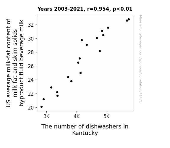 This means 91% of the change in the one variable (i.e., The number of dishwashers in Kentucky) is predictable based on the change in the other (i.e., US average milk-fat content of milk fat and skim solids byproduct fluid beverage milk) over the 19 years from 2003 through 2021.