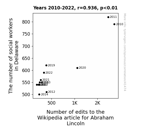 This means 87.6% of the change in the one variable (i.e., Number of edits to the Wikipedia article for Abraham Lincoln) is predictable based on the change in the other (i.e., The number of social workers in Delaware) over the 13 years from 2010 through 2022.