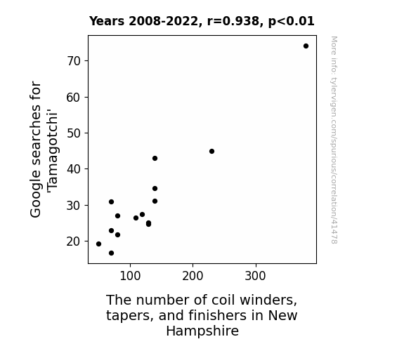 This means 88% of the change in the one variable (i.e., The number of coil winders, tapers, and finishers in New Hampshire) is predictable based on the change in the other (i.e., Google searches for 'Tamagotchi') over the 15 years from 2008 through 2022.