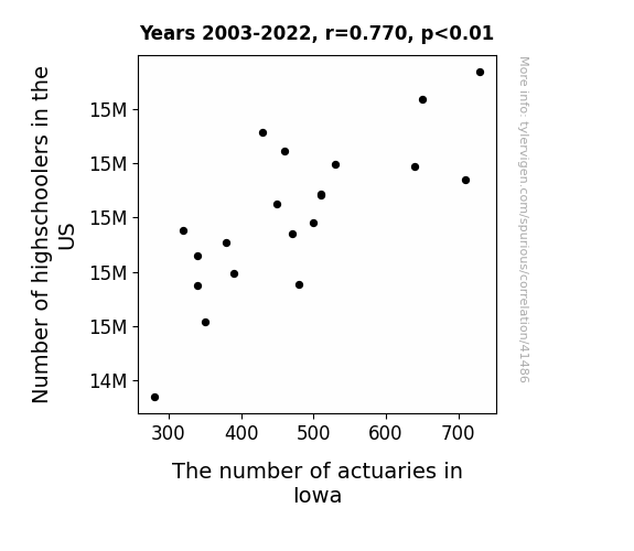 This means 59.3% of the change in the one variable (i.e., The number of actuaries in Iowa) is predictable based on the change in the other (i.e., Number of highschoolers in the US) over the 20 years from 2003 through 2022.