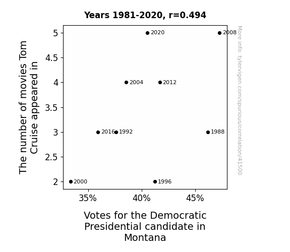 This means 24.4% of the change in the one variable (i.e., Votes for the Democratic Presidential candidate in Montana) is predictable based on the change in the other (i.e., The number of movies Tom Cruise appeared in) over the 9 years from 1981 through 2020.