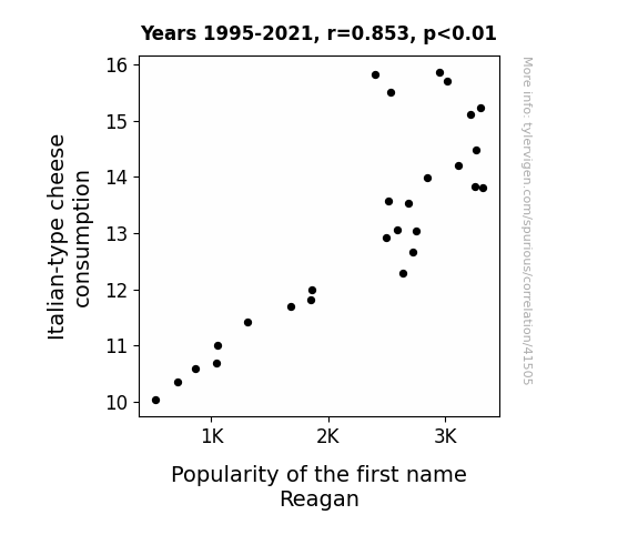 This means 72.8% of the change in the one variable (i.e., Popularity of the first name Reagan) is predictable based on the change in the other (i.e., Italian-type cheese consumption) over the 27 years from 1995 through 2021.
