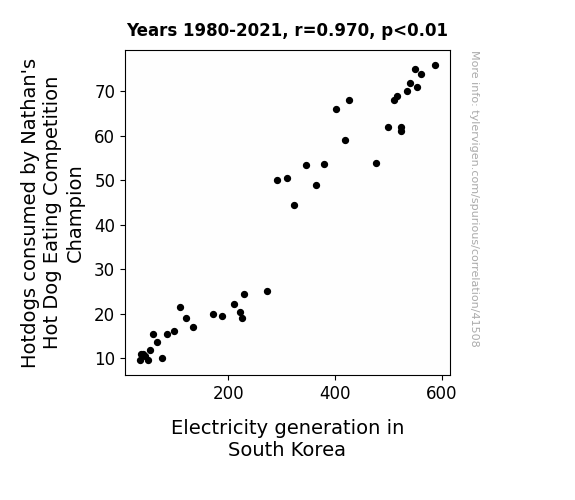 This means 94.1% of the change in the one variable (i.e., Electricity generation in South Korea) is predictable based on the change in the other (i.e., Hotdogs consumed by Nathan's Hot Dog Eating Competition Champion) over the 42 years from 1980 through 2021.