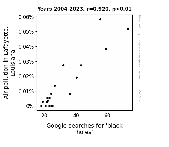 This means 84.7% of the change in the one variable (i.e., Google searches for 'black holes') is predictable based on the change in the other (i.e., Air pollution in Lafayette, Louisiana) over the 20 years from 2004 through 2023.