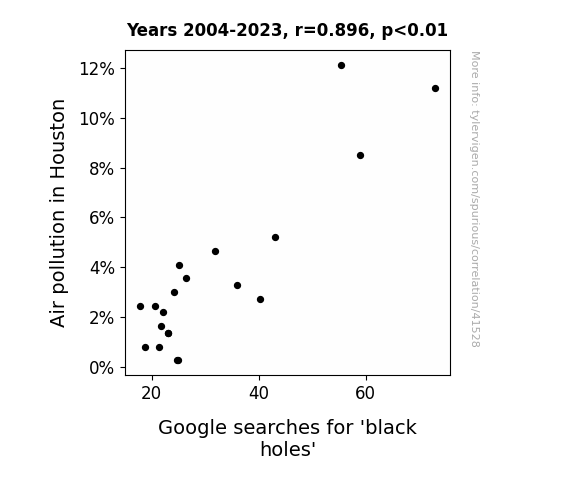 This means 80.2% of the change in the one variable (i.e., Google searches for 'black holes') is predictable based on the change in the other (i.e., Air pollution in Houston) over the 20 years from 2004 through 2023.