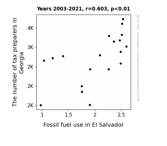 This means 36.3% of the change in the one variable (i.e., Fossil fuel use in El Salvador) is predictable based on the change in the other (i.e., The number of tax preparers in Georgia) over the 19 years from 2003 through 2021.