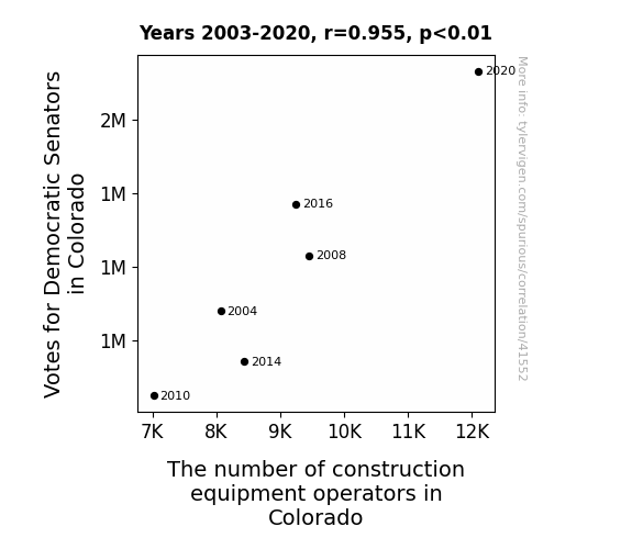 This means 91.2% of the change in the one variable (i.e., The number of construction equipment operators in Colorado) is predictable based on the change in the other (i.e., Votes for Democratic Senators in Colorado) over the 6 years from 2003 through 2020.