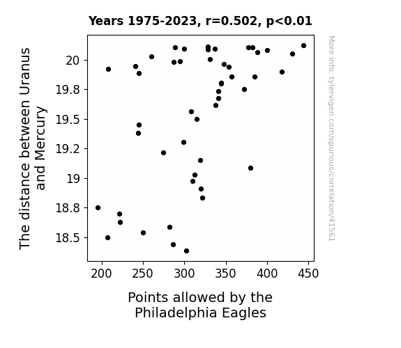 This means 25.2% of the change in the one variable (i.e., Points allowed by the Philadelphia Eagles) is predictable based on the change in the other (i.e., The distance between Uranus and Mercury) over the 49 years from 1975 through 2023.