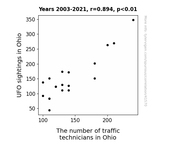 This means 80% of the change in the one variable (i.e., The number of traffic technicians in Ohio) is predictable based on the change in the other (i.e., UFO sightings in Ohio) over the 19 years from 2003 through 2021.