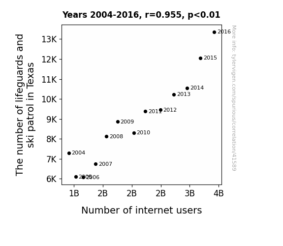 This means 91.3% of the change in the one variable (i.e., Number of internet users) is predictable based on the change in the other (i.e., The number of lifeguards and ski patrol in Texas) over the 13 years from 2004 through 2016.