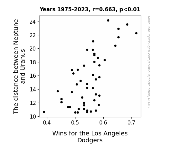 This means 43.9% of the change in the one variable (i.e., Wins for the Los Angeles Dodgers) is predictable based on the change in the other (i.e., The distance between Neptune and Uranus) over the 49 years from 1975 through 2023.