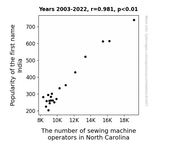 This means 96.3% of the change in the one variable (i.e., The number of sewing machine operators in North Carolina) is predictable based on the change in the other (i.e., Popularity of the first name India) over the 20 years from 2003 through 2022.
