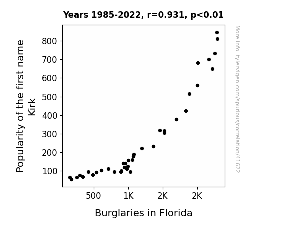 This means 86.8% of the change in the one variable (i.e., Burglaries in Florida) is predictable based on the change in the other (i.e., Popularity of the first name Kirk) over the 38 years from 1985 through 2022.