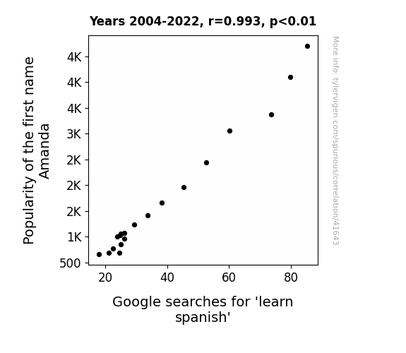 This means 98.6% of the change in the one variable (i.e., Google searches for 'learn spanish') is predictable based on the change in the other (i.e., Popularity of the first name Amanda) over the 19 years from 2004 through 2022.