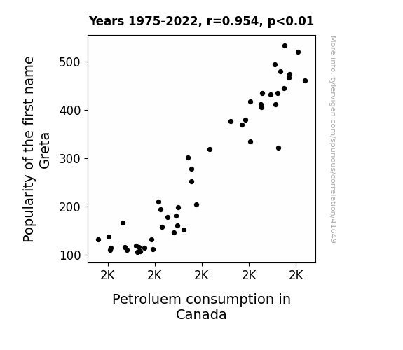This means 91% of the change in the one variable (i.e., Petroluem consumption in Canada) is predictable based on the change in the other (i.e., Popularity of the first name Greta) over the 48 years from 1975 through 2022.