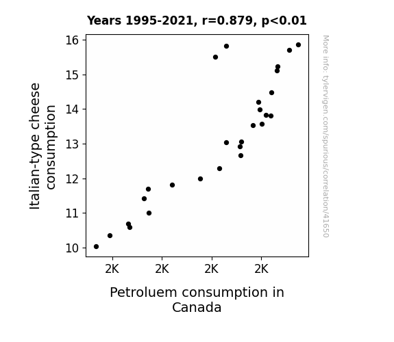 This means 77.2% of the change in the one variable (i.e., Petroluem consumption in Canada) is predictable based on the change in the other (i.e., Italian-type cheese consumption) over the 27 years from 1995 through 2021.