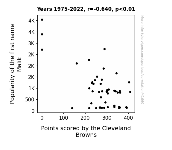This means 41% of the change in the one variable (i.e., Points scored by the Cleveland Browns) is predictable based on the change in the other (i.e., Popularity of the first name Malik) over the 48 years from 1975 through 2022.