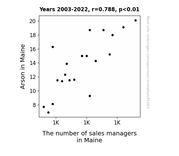This means 62.1% of the change in the one variable (i.e., The number of sales managers in Maine) is predictable based on the change in the other (i.e., Arson in Maine) over the 20 years from 2003 through 2022.
