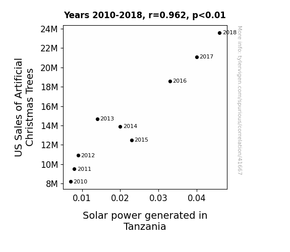 This means 92.5% of the change in the one variable (i.e., Solar power generated in Tanzania) is predictable based on the change in the other (i.e., US Sales of Artificial Christmas Trees) over the 9 years from 2010 through 2018.