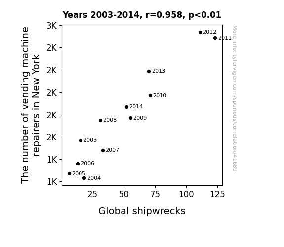 This means 91.9% of the change in the one variable (i.e., Global shipwrecks ) is predictable based on the change in the other (i.e., The number of vending machine repairers in New York) over the 12 years from 2003 through 2014.