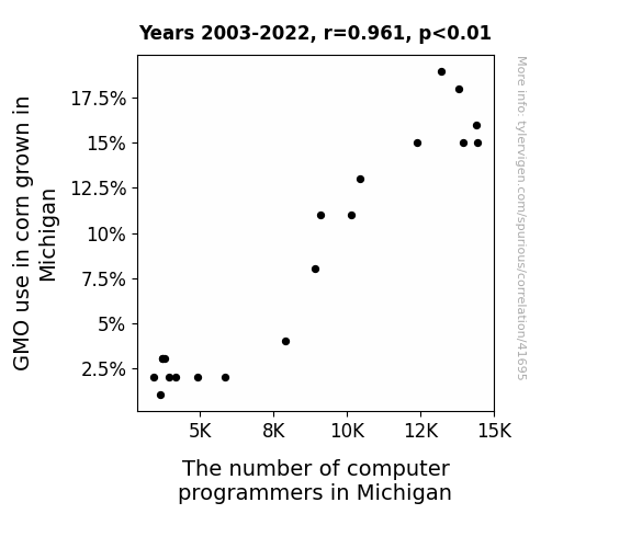 This means 92.4% of the change in the one variable (i.e., The number of computer programmers in Michigan) is predictable based on the change in the other (i.e., GMO use in corn grown in Michigan) over the 20 years from 2003 through 2022.