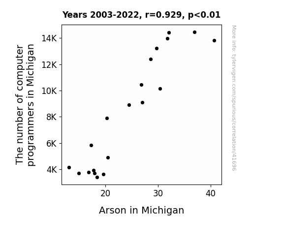 This means 86.3% of the change in the one variable (i.e., Arson in Michigan) is predictable based on the change in the other (i.e., The number of computer programmers in Michigan) over the 20 years from 2003 through 2022.