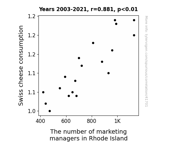 This means 77.6% of the change in the one variable (i.e., The number of marketing managers in Rhode Island) is predictable based on the change in the other (i.e., Swiss cheese consumption) over the 19 years from 2003 through 2021.