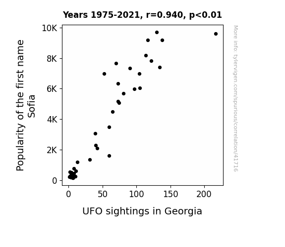 This means 88.4% of the change in the one variable (i.e., UFO sightings in Georgia) is predictable based on the change in the other (i.e., Popularity of the first name Sofia) over the 47 years from 1975 through 2021.