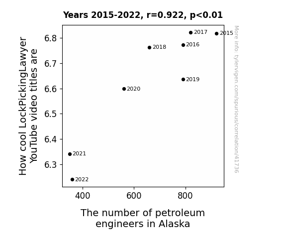 This means 85% of the change in the one variable (i.e., The number of petroleum engineers in Alaska) is predictable based on the change in the other (i.e., How cool LockPickingLawyer YouTube video titles are) over the 8 years from 2015 through 2022.