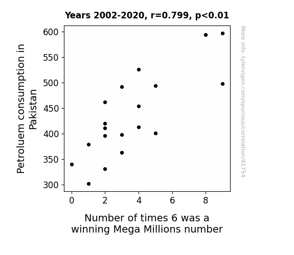 This means 63.8% of the change in the one variable (i.e., Number of times 6 was a winning Mega Millions number) is predictable based on the change in the other (i.e., Petroluem consumption in Pakistan) over the 19 years from 2002 through 2020.