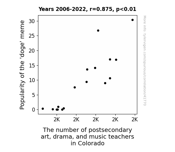 This means 76.6% of the change in the one variable (i.e., The number of postsecondary art, drama, and music teachers in Colorado) is predictable based on the change in the other (i.e., Popularity of the 'doge' meme) over the 17 years from 2006 through 2022.